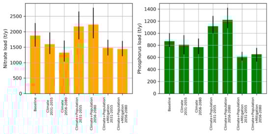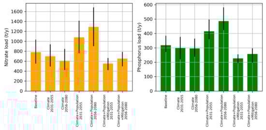 Despite the large uncertainty of the nutrient load figures resulting from the model, the relative changes from the baseline can be interpreted as more reliable than the absolute values. This is because some of the model biases are constant under all scenarios and thus can be eliminated when computing percentage variations from the baseline. A further sign of reliability of the relative changes computed from the model is that all model parameter sets consistently indicate the same variation from the baseline (with small differences). Therefore, the percentage variations indicated in Table 3 can be taken with more confidence than the absolute values. They show that the climate change signal, which is likely to reduce rainfall and increase evapotranspiration [,], is likely to reduce runoff and therefore to reduce diffuse nutrient loads from agricultural areas. However, the reduction is predicted to be small, especially for phosphorus, for which the diffuse-source input has a relatively low importance compared to the inputs from wastewater effluents. Furthermore, the model results indicate that the expected variation of nutrient loads triggered by climate change are all within the range of uncertainty of the model forecasts (see the uncertainty bars in Figure 6, which describe the variance of the model results), thus suggesting that the amplitude of the climate change impact signal is within the variability of the natural processes under baseline climatic conditions.