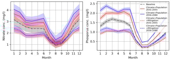 When considering mitigation measures, the most likely is an improvement in the treatment of effluents at sewage treatment plants. Typically, across the world, the move from primary and secondary treatment to incorporate tertiary treatment can reduce nutrient loads by approximately 50% [], although this will vary depending on the particular technology adopted. The impact of wastewater pollution reduction (mitigation) was estimated by analysing a scenario in which the concentration of nutrients in the wastewater is reduced by half the baseline scenario. Therefore, this paper analyses whether a significant improvement of wastewater treatment abilities would translate in an equally significant improvement in river water quality.