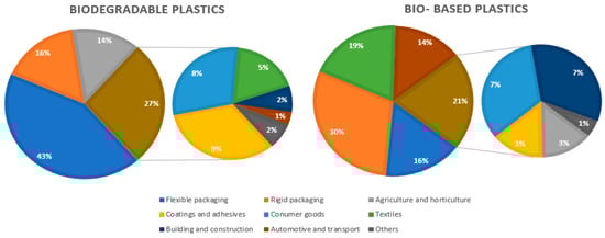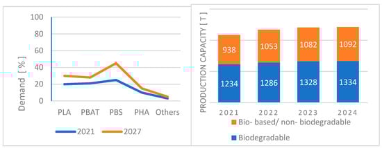 One of the important issues in the field of sustainable development is the production and demand for plastic products. Given the results of current surveys, which point to the enormous market in particular areas, we can expect an increase in demand, production, and plastic waste in 2021–2027 []. Due to the global commitment to sustainable development in the production, processing, and disposal of plastic waste, products made of bio-based plastics and biodegradable plastics are increasingly preferred []. In connection with the environmental burden, a combination of both categories is, of course, ideal. As we can see in Figure 1, there is currently interest in BIO-plastics in various industries and sectors. The majority demand for plastic products can be observed mainly in the production of packaging materials []. However, compared to previous years, we can see a significant increase in the automotive and construction industries. BIO plastics play a major role in reducing vehicles’ weight and the associated fuel savings that directly affect CO2 production, reducing the environmental burden by consolidating these emissions [].