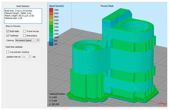 There is a lot of software for processing files into a program understandable to FDM devices. Some of this software is created by the device manufacturer, and their function parameters are modified for a specific device and its operation. Others do not have this limitation, and their use is general []. An important category was open-source programs. This type of program allowed a massive intervention in the parameters and operating conditions of the process itself and intervention in the resulting script, which allowed additional data manipulation. Programs considered included Cura and Simplify3D (Figure 4). These programs would enable us to perform all the necessary interventions associated with the modification of parameters for FDM equipment and optimize the production process to ensure the ideal production process of the optimized model.