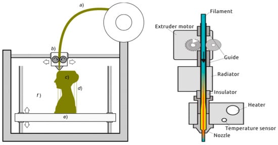Diagram of fused deposition modeling (FDM) device and print head [,].