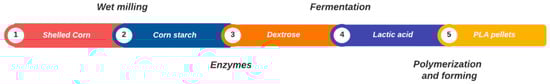 As already mentioned, there are currently many plastic materials on the market that are biodegradable, formed based on biodegradation, or a combination of both [,]. Most of them are suitable for filament management and subsequent use by FDM devices. In our case, we were mainly interested in the PLA material. Previous research indicates that the PLA material is formed by processing and subsequent polymerization of corn and potato starch []. A simplified procedure of this process can be seen in Figure 7. Therefore, it is noticeable that the processing of this material from plant components is relatively simple, no by-products are formed, and the material is partially degradable []. Besides, PLA can be considered as a typical and basic plastic material for additive production. The problem only occurs when processing PLA waste []. Its partial degradability can be interpreted as the ability to decompose under precise, direct laboratory conditions, which, e.g., in landfills, composts or seawater are difficult to find. Based on several publications, such as e.g., Plazza D. et al., Degradation of PLA in a simulated marine environment after 600 days, 2017, points to the extreme resistance of PLA material in a marine environment. It also states that a reduction in the resistance of the material in this environment can be achieved by using natural fibers, such as cellulose [,].