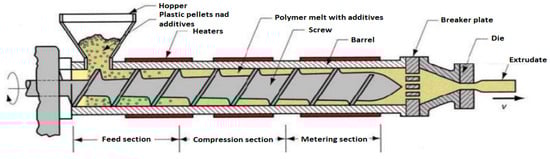 Our research aimed to simulate the topological optimization of models made of PLA plastic with cellulose admixture. This material must first be processed into a filament, i.e., a fiber usable for FDM devices []. Fiber production was a process that allowed us to process plastic granulate into a string with diameters of 1.85 and 3 mm. The actual output of the filament intended for the FDM technology took place on devices whose operation principle was based on the following scheme (Figure 9) []. These devices worked with either one or two screws. The difference in the resulting extruded material was the degree of mixing of the composite material’s components.