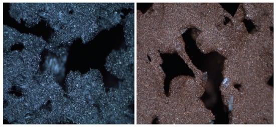 One of FDM technology’s main limitations is the surface quality of the created models and their strength []. These shortcomings are due to the same method of layering the thermoplastic material, which causes various kinds of deformations and weaknesses []. These include, for example, an error in the layering of composite materials. It may be due to the insufficient density of the filling, or the inadequate number of perimeters enclosing the model at its lower or upper part. These defects can be seen in Figure 10. Similar defects are assumed for composites with a higher cellulose content. The higher cellulose content caused the material to crumble and weaken. Due to these facts and the fact that cellulose contains hydrogen bonds, which are problematic in the extrusion itself, we assumed similar defects in these samples (Figure 10).