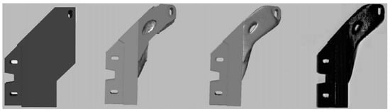 The design and modification of a component usually consist of the transformation of already designed and used parts, the parameters, and the design used for a long time []. If the usual procedure is not available, the creation of conceptual designs is followed. These consist of the structure of parameters that reflect the environment’s requirements in which the component is used. Then the whole process is adapted to the possible ways of conventional production [,]. An alternative to this design is to use the optimization of the shape of the components and their topology. This method is used in cases where it is necessary to design or modify a model to be located in a particular place, withstand predefined forces, or relieve it. Topological optimization is thus a way of creating components from complex blocks []. Their final shape is the result of parameters defined before the process itself. These parameters include e.g., minimizing/maximizing volume, displacement, or the ability to resist displacements, minimizing the size of the elements used (Figure 11) [].