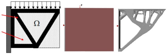 Topological optimization is a form of structural optimization that aims to design the resulting model’s optimal shape [,]. In essence, this means that the material is distributed only where it is necessary in terms of loading during the optimization process (Figure 12) []. The body thus proposed was decomposed into a lattice (network) using the finite element method; this network is called an isotropic solid microstructure [].
