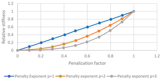 The use of the so-called penalty factor p reduces the impact of elements with intermediate densities on the model’s resulting stiffness. The penalty factor optimizes the solutions to clearly define which of the elements are full (pe = 1) or empty (pe = 0). For materials with Poisson’s constant v = 0.3, it is recommended to use a penalty factor p = 3 [].