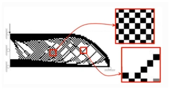 The SIMP method is a common standard in topological optimization and was also used by our chosen Inspire program. This method was especially evident in the production area, given the possibility of integrating production requirements and constraints, which were directly implementable in the optimization process and the subsequent creation of a model suitable for production []. The optimal solution was if all elements were filled to 100% or 0%. Due to its course, the SIMP method had several problems. A significant complication in this direction was the use of a lattice (network) structure of models. In the technical field, this problem is called checkerboard. The checkerboard problem consisted of a periodic pattern created during optimization, which was formed by elements with a density of 100% and 0%, the location of which did not correspond to the optimal distribution of the material [,]. This negative phenomenon could be classified as a third “product” that was not penalized during optimization. Its occurrence was caused by errors arising in the definition of finite elements, as a consequence of increasing stiffness, which was excessively interconnected in the corners of the model []. The emerging pattern itself was initially considered part of the optimized microstructure but was later reclassified to numerical noise. By eliminating it from the optimization process, the resulting model was somewhat closer to its ideal shape (Figure 14) [].