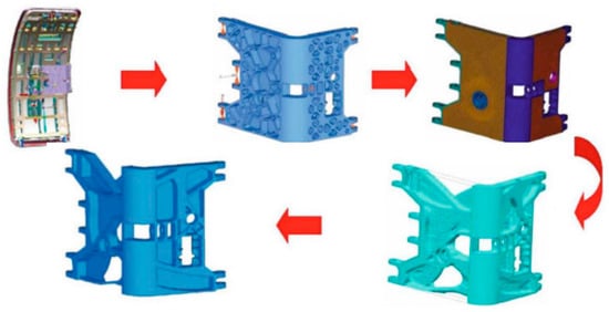 As an example of the work of the optimization software working with the SIMP method, we can mention the support of the Fairchild Dornier 728–100 aircraft doors (Figure 15) []. The optimization aimed to reduce the weight and maintain the rigidity of this model. The optimization result was a model, later a part with the resulting weight, which was 20% lower than the original model, respectively, its weight was reduced from 9.16 kg to 7.5 kg. The time required to design this model was also reduced from 3 months to 3 weeks [].
