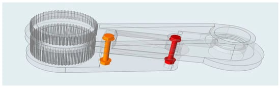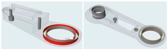 The next function was the partition. This feature belongs to the modeling category. It allowed us to define the area around, for example, holes for screws, gears, etc. without re-exporting/importing and modifying the original CAD system []. An example of this function is shown in Figure 18. As part of the assignment’s solution, we used this function to define the holes for screws, bearings, and the toothing area of arm 1. It represented the truncated area was still linked to the original model, but couldd be ignored during optimization [,]. Subsequent to the optimization process that we used in the work solution, the task was to reduce the volume of material of the model according to the set conditions, the definition of these areas was necessary. Otherwise, they would be deformed to partial removal, which would prevent e.g., bearing placement or creating screw connections.