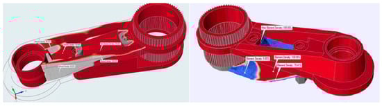 Based on the results of the analyses shown in Figure 22, the software automatically suggested possible areas with different percentages of material savings or sites penalized by loss or partial reduction in their volume []. As can be seen, despite the same boundary conditions, these results were markedly different. Due to several other parameters with which we could intervene in the optimization process itself, we focused on three specific ones connected with our solution []. Among the parameters that could be manually intervened in the optimization process were e.g., maximum and minimum width of walls, frequency of oscillation of the system, way of drawing the optimized part’s geometry, and many others []. Three of these parameters were decisive for our solution since we were considering a robot system type arranged to SCARA structures as a device whose components were created using FDM technology. The first choice was to reduce the volume. Two parameters limited this, the first was the percentage of the resulting model volume, and the second was the safety factor. We used the default mean value proposed by the software-derived work from a safety factor of 1.2. Thus, the volume reduction for all optimized models was 30%. We set the parameter limiting the minimum width of the walls or columns to 120% of the value of the hole’s diameter located on the printing nozzle []. This device was to produce the resulting components. Due to the mechanical limit of the printhead FDM device [], it was not physically possible to form an element with a radius equal to or smaller than the nozzle diameter. The method of plotting the optimized areas’ geometry was chosen so that each of the models had one flat bearing surface []. It would ensure better placement of the model on the printing pad and increase its adhesion.
