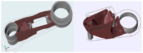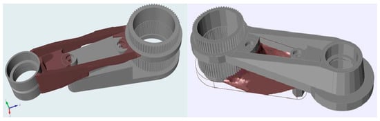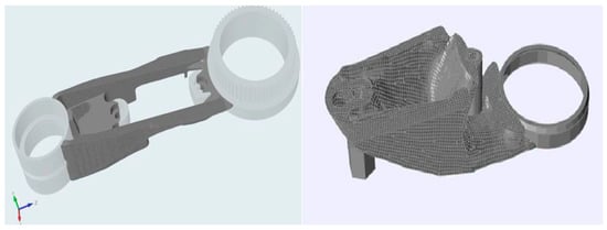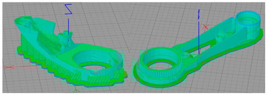 The resulting models, shown in Figure 24, were reconnected to the non-optimized parts after modification and exported in STL format []. This format was used to generate paths and parameters for FDM additive manufacturing equipment. Subsequent processing of these files can be seen in Figure 25.