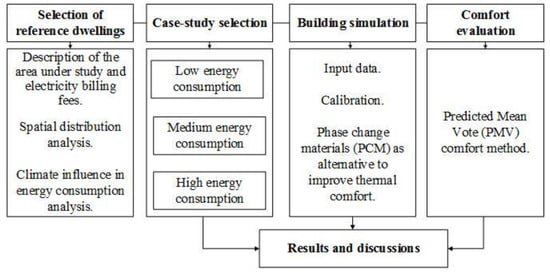 This study initially analyzes the electricity consumption, the geographical location, and the influence of the climate on an urbanization that has houses with similar architectural characteristics. Through this analysis, 3 representative case studies were selected. The results of the thermal behavior of the study cases were obtained through energy simulation, and the thermal comfort was evaluated using the PMV method during 2019. In addition, 5 alternatives for improvement were proposed that were compared with the results of the current state. The alternatives evaluated include the use of phase change materials in walls. The methodology used in this research follows the steps shown in Figure 1.