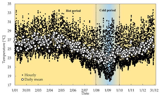 The climatic profile is an EnergyPlus weather file (EPW), developed by the U.S. Department of Energy. The file selected for Guayaquil was created from the data originating from the Meteorological station installed in Socio Vivienda 1. The hourly and daily data in 2019 are shown in Figure 4. The information was compared with the official Ecuadorian meteorological institution INAMHI, which supposes hot and rainy winters (August and September) and very hot and dry summers (January to July and October to December).