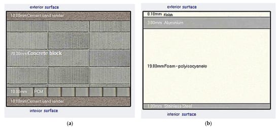 Moreover, both studies were conducted for Guayaquil city, which has a humid—very hot climate. According to climate-habitational zoning, the use of PCMs as constructive elements must be directed to walls so the phase changing effect will take place. For this reason, for energy evaluation, the 4 previously described materials were incorporated in the house’s external walls. Furthermore, it was proposed to totally change the actual roof for one, locally accessible, made of insulating materials. PIR (polyisocyanate) material of 23.1 mm thickness was evaluated. The constructive sets for walls and roof are detailed in Figure 5. According to the materials used in walls and roofs, different study cases were defined. The base case corresponds to the house with its original envelope materials; Case 1 corresponds to the house with a 23.1 mm thick polyisocyanate roof. The remaining cases correspond to the house with a polyisocyanate roof and all the external walls with a specific PCM: Case 2 with Bio PCM Q29, Case 3 with n-octadecane, Case 4 with RT25-RT30, and Case 5 diatomite earth unused.
