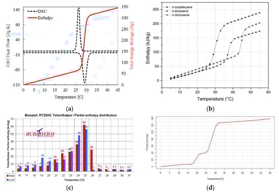 Temperature [°C] vs. Enthalpy [KJ/Kg] properties of study Phase Change Materials (PCMs). (a) BioPCM Q29 (Case 2) [44], (b) n-octadecane (Case 3) [45], (c) RT25-RT30 (Case 4) [46], (d) Diatomite (Case 5) [18].