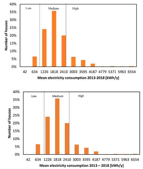 Through the applied methodology for the selection of the reference dwellings, the following results were obtained: (i) the representative values of the annual electricity consumption of the dwellings for residential use, (ii) the historical trend of electricity consumption depending on the geographical location, and (iii) the level of influence of the climate on the use of electricity.