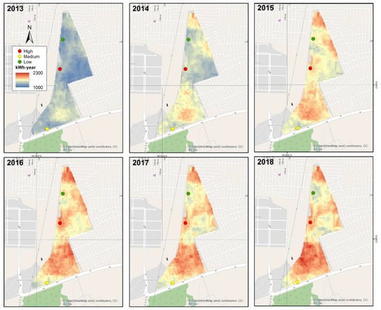 The spatial distribution analysis was performed from 2013 to 2018, and the obtained results are shown in Figure 8. The linear models applied to the sample allowed us to determine the consumption for the entire area of study. Figure 8 displays the consumption models obtained for SV1 estate.