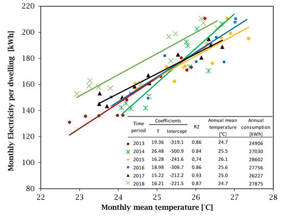 Considering that the energy consumption related to air conditioning systems is highly influenced by ambient temperature [11], it is necessary to know the correlation that exists between these factors (monthly electricity consumption and monthly ambient temperature mean). To define the correlation grade between these factors, a mathematical function was defined by developing a linear regression between the analyzed variables. It was established as a function of the determination coefficient R2 [35].