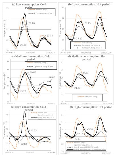 As observed in Figure 17, the implementation of PCM RT25-RT30 in the internal walls of the dwelling and the roof change (case 4) accomplished the highest percentage of comfortable hours compared to the other cases. Furthermore, only 1% of uncomfortable hours are caused by low temperature. These low temperatures could be attributed to the overuse of the A/C systems and can be avoided by using PCMs.