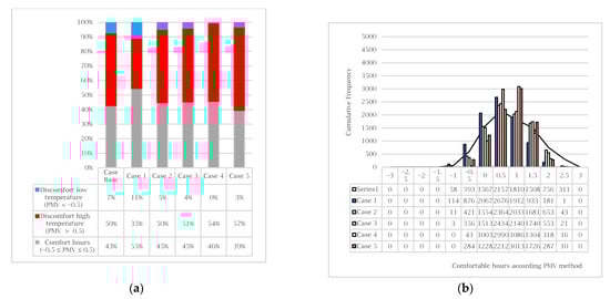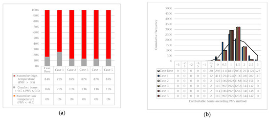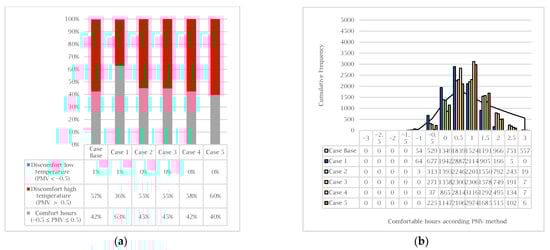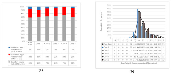 PMV evaluation in medium consumption dwelling. (a) Percentage comfort and discomfort hours and (b) Cumulative frequency hours.