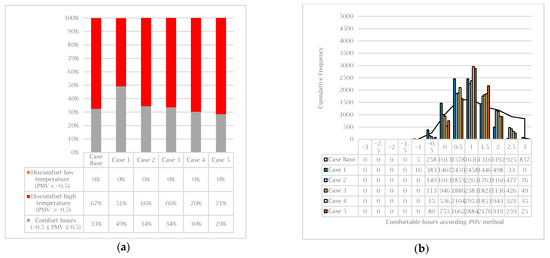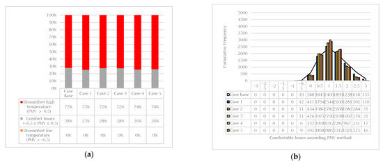 With the previously mentioned data and the environmental conditions obtained from energy simulation inside the houses, the PMV method was applied and its results are shown below further. These results are compared by frequency histograms: (a) total comfortable hours percentage (−0.5 < PMV < 0.5), total uncomfortable hours by low-temperature percentage (PMV < −0.5), and total uncomfortable hours by high-temperature percentage (PMV > 0.5) and (b) total hours for each division, with 0.5 step from “(−3) very cold” to “(3) very hot”.