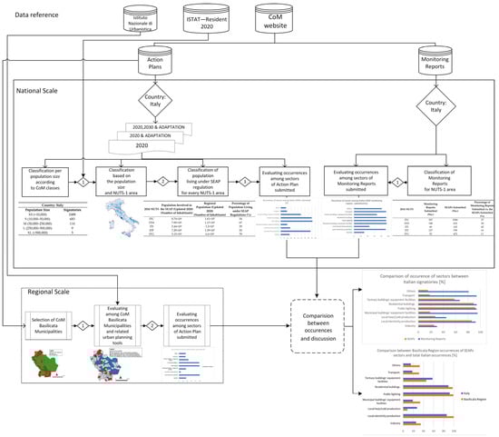 The results are divided into three sections, investigating the Italian CoM experience with related Monitoring Report (MR) and a final focus on the Basilicata Region, selected as the study case. The first section explores the Italian CoM experience (2008–2020), evaluating the number of Italian signatories and SEAPs submitted, the size of the signatories in terms of the resident population as of 2020, the resident population under SEAP regulation as of 2020, and the occurrences of the sectors in the Italian SEAPs. The second section is related to the MRs, considered a fundamental step in evaluating the SEAPs. Data on the MRs available on the CoM website, in terms of sector occurrences, are reported and compared to the Italian SEAPs submitted. The third section focuses on the Italian experience through the case study of the Basilicata Region, where CoM signatories are 64% of the total Basilicata Municipalities.