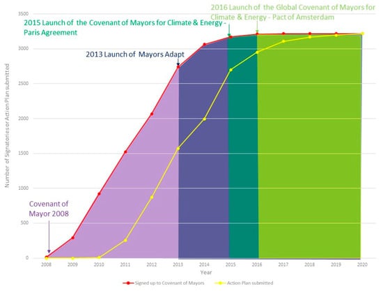 The Covenant of Mayors (CoM) was launched in 2008 in Europe fostering an ambition to gather local governments voluntarily and committed to achieving and exceeding the EU climate and energy targets []. In October 2015, the new Covenant of Mayors for Climate & Energy was launched. Its goals were defined with cities through a consultation process and are ambitious and broad-ranging: signatory cities are now committed to actively supporting the implementation of the EU 40% greenhouse gas (GHG)-reduction target by 2030 and agree to adopt an integrated approach to climate change mitigation and adaptation and ensure access to secure, sustainable and affordable energy for all. In the same year, the EU signed the Paris Agreement []. This global strategy integrates energy and climate policies including the so-called 20/20/20 targets [], namely, the reduction of carbon dioxide (CO2) emissions by 20%, an increase in the market share of renewable energy to 20%, and a 20% increase in energy efficiency. In June 2016, the Covenant of Mayors entered a relevant new phase of its history, joining with another city initiative, the Compact of Mayors.