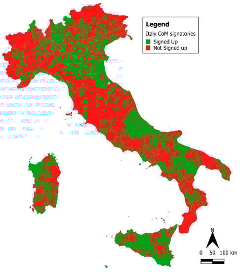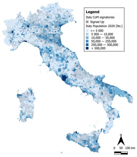 Information on the Italian signatories regarding the availability of the MRs was spatialized into a GIS environment. Such data deriving from the CoM website were collected in a comma-separated values (CSV table and merged with the resident population data as of 1 January 2020 from ISTAT [] in order to be able to perform basic statistics identifying per capita impacts.