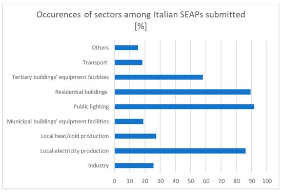 In the second and third features are the “sectors” included in the SEAP structure: industry, local electricity production, local heat/cold production, municipal buildings, equipment/facilities, public lighting, residential buildings, tertiary buildings, equipment/facilities, transport, and others. Therefore a “sector” represents an intervention area characterized by specific actors, emissions, and actions. For these sectors, every CoM signatory defines actions and investments. We investigated the occurrence of these sectors among the Italian SEAPs submitted, in order to identify the occurrences and, consequently, obtain a comprehensive national picture of the sectoral specialization of the SEAPs (see Figure 5).
