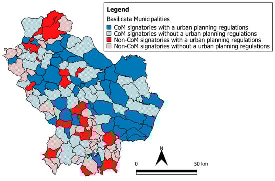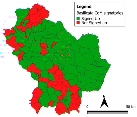 In order to compare the institutional planning provided by the law as opposed to European plans on climate or energy such as SEAPs, the data concerning institutional urban planning that were derived from the report of the Italian Urban Planning Institute (Istituto Nazionale di Urbanistica (INU)) [] were merged with the information about the CoM signatories, considering, as a case study, the Basilicata Region.