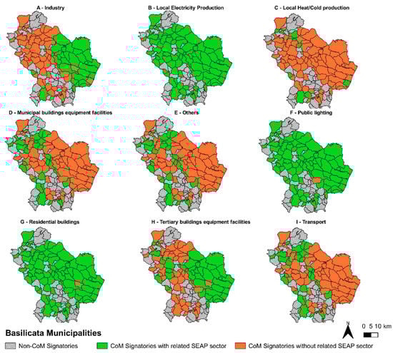 In Figure 11, a spatialization of the data on the Basilicata Municipalities’ SEAP sectors’ occurrences is proposed so as to provide a territorial assessment of the CoM experience in the Basilicata Region.