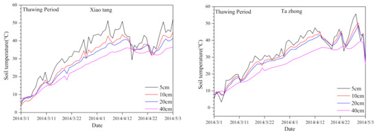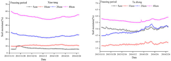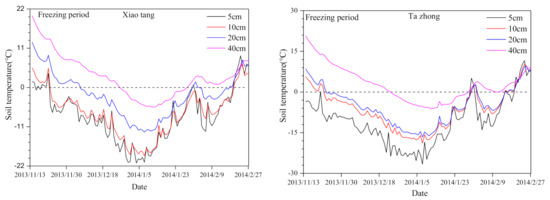 The diurnal variation of soil temperature is similar at the same depth. At 20 cm and 40 cm depths, the two sites had the largest daily variation. At the Xiaotang station, the freezing times of soils at 5 cm and 10 cm depths were very close on 23 November, 2013. The freezing time of the soil at 20 cm depth occurred relatively late on 8 December, 2013 (i.e., 11 days after the freezing time at 10 cm depth). The soil at 40 cm depth entered the freezing period in December 2013. Consistent with a study conducted by [