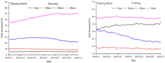 The soil moisture content during freezing at 5 cm, 10 cm, 20 cm, and 40 cm depths at the Xiaotang station was 6%, 10%, 29%, and 59%, respectively, and those at the Tazhong station were 5%, 3.6%, 4.4%, and 5.8%), respectively. As the ambient temperature continued to decrease, the freezing front moved downward and the soil water contents at all depths decreased.