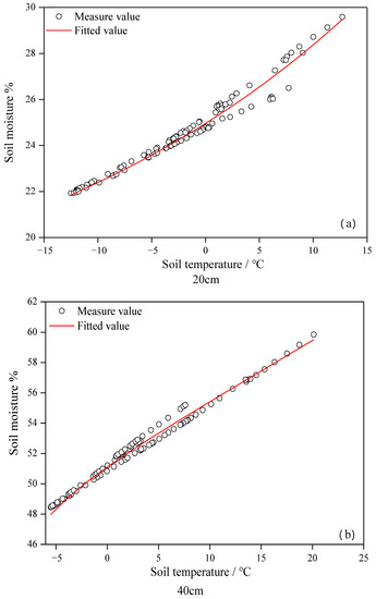 S) data were used to establish a regression model. These two parameters were connected to establish a coupling model of soil moisture content and temperature at soil depths of 20 and 40 cm, respectively. Here we compare the observed values and analyze the error of the model. During the freezing-thawing cycle of the soil, the regression model constructed using soil moisture content and temperature can be expressed by a unified equation (see