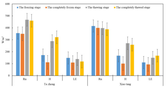 Figure 2). Due to the influence of solar radiation, the diurnal variation of H is greater than that of LE. During the period of complete freezing, the diurnal variation of Rn is quite obvious in the change of its flux. This phenomenon might be due to the heat preservation effect of the ice-bearing layer formed during the complete freezing of the soil and the surface albedo during the snowfall.
