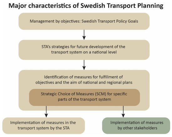 The role of the Strategic Choice of Measures (SCM) approach in Swedish transport planning as conducted by the Swedish Transport Administration (STA). The scheme only shows the major characteristics of the planning system. The light beige boxes show characteristics of transport planning governed by the STA. The brown box shows where the SCM process is located in the overall planning system. The green box shows that not only does the outcome of the SCM process lead to measures implemented by STA but also measures implemented by other stakeholders. The figure is developed based on [13,26,32].