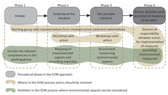 The figure provides a description of activities within each procedural phase (1–4) in the SCM approach. It is a complement to Figure 2. The green colored activities are examples of activities where environmental aspects can be taken into consideration. The figure is developed based on [13].