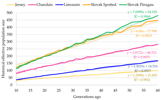 The NeLD estimates confirmed a continuous decrease in effective size with the increasing number of generations in each analysed population (Figure 1). The lowest recent effective population size was found for Limousin (14.52 animals), while the highest NeLD showed Slovak Spotted cattle (77.99 animals). Even if the effective population size of Slovak Pinzgau was higher compared to Jersey, Charolais, or Limousin, it showed the most intensive decrease of animals’ number per generation (7.10 animals). The fact that the current effective size of analysed populations was low means that populations could be partially considered as significantly endangered by the loss of genetic diversity. According to Franklin [44], populations with Ne lower than 50 animals may be at immediate risk of extinction. Other authors also refer to this value as the threshold for the long-term survival of the population. For example, Meuwissen [45] stated that a minimum effective size of 100 individuals is needed to ensure the long-term viability of an animal population. This is because small populations are subject to a loss of genetic variability due to inbreeding or genetic drift much faster than populations with higher numbers of individuals. The significant loss of genetic diversity in a small population can lead to reducing its competitiveness and adaptability in a changing production environment.