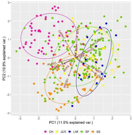 Figure 2 shows the genetic differentiation of analysed populations due to SNP polymorphisms (specific frequency of haplotypes) in genes responsible for carcass traits. Carcass traits, including marbling, tenderness, and meat colour are critical parameters that are usually used to assess the freshness, eating quality, and safety of beef products. As can be seen in Figure 2, the diversity based on the genetic polymorphism of the monitored genes showed individual differences among breeds, mainly in the case of Charolais population. The Charolais cattle was separated from other populations due to the genetic polymorphisms of CAPN1 gene (μ-calpain) that is responsible for the post-mortem tenderisation process [46]. Calpains (CAPN1, CAPN2, CAPN3) together with their endogenous inhibitor calpastatin (CAST) were significantly associated in previous studies with meat tenderness [47,48] and marbling score [49]. The genetic polymorphisms in PLAG1, SREBP1, LCORL, MYF5, and MYOD1 genes resulted in partial genetic differentiation of Slovak Spotted cattle from other populations in the analysis. The PLAG1 and LCORL genes were associated with carcass weight in several breeds, including Simmental, Charolais and Limousin cattle [50,51,52]. The SREBP1 gene has an essential role in the lipogenesis and fatty acid composition in fat cells and was consequently considered to influence the beef nutritional quality [53]. The genetic variants of MYF5 genes were associated with growth traits, genetic indices, morphological scores, backfat thickness and meat tenderness [54,55,56]. The polymorphisms of MYOD1 and MYF6 genes were found to be important for growth and muscle development, carcass traits and beef quality [57]. In the case of Limousin population, partial genetic differentiation was detected because of polymorphisms in the MSTN and CAST genes. The MSTN (myostatin) gene is responsible for the double-muscle phenotype in several breeds, including Limousine [58]. In the middle of genetic clusters were located Jersey and Slovak Pinzgau populations which genetic variability was affected by polymorphisms in LEP, OLR1, CAPN3, CAPN2, TG, MYF6, and MYOG genes. The leptin (LEP) as metabolism-related hormone influencing animal growth and fattening was found in cattle to be related to various carcass traits [59]. The OLR1 gene is involved in lipid synthesis and fat accumulation in adipose tissue. This gene was significantly associated with rump fat thickness and weaning weight [60]. The thyroglobulin (TG) gene was studied as an important gene for fat deposition in cattle [61].