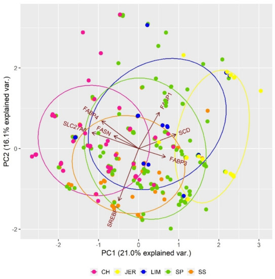 Figure 3 shows the impact of SNP polymorphisms in genes connected to fatty acid composition in a muscle on inter-population genetic differentiation. The composition of fatty acids in bovine adipose tissue is a very important trait that affects the taste, tenderness, and overall eating quality of beef. Based on the observed results, it can be stated only individual variability that cannot be generalised to the population (breed) level. Overall, SNP polymorphisms of seven genes associated with fatty acid composition were studied (Table 2). The FABP gene family, in this study represented by FABP1, FABP3 and FAPB4 genes, affect various cellular processes, including lipid metabolism. The FABP3 protein was identified in several tissues with a high demand for fatty acids such as cardiac and skeletal muscle and lactating mammary gland. The FABP4 protein, expressed in adipose tissue, was associated with lipid metabolism (lipolysis and lipogenesis), marbling, and back fat deposition [62]. The polymorphisms in SLC27A6, FABP3, and FABP4 genes can affect the sensitivity of fatty acid uptake from the blood and its transport into the epithelial cells [63]. The polymorphisms in FASN gene encoding fatty acid synthetase affected the concentration of monounsaturated and saturated fatty acids in beef [64]. Various studies confirmed the effect of bovine stearoyl-CoA desaturase (SCD) and sterol regulatory element-binding protein (SREBP1) genes on the fatty acid composition [65,66].