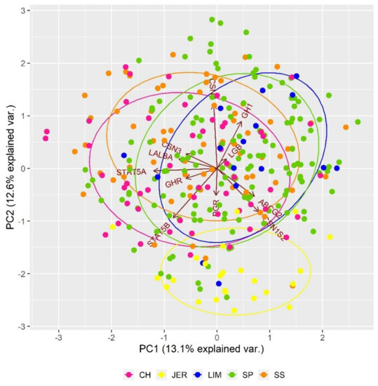 The PCA analysis of genetic differentiation based on SNP polymorphisms in genes related to milk production traits (Figure 4) indicated that the Jersey population is separated from others, mainly due to the polymorphisms in CSN1S2 gene. In general, the casein family consists of several molecular forms, including insoluble (CSN1S1, CSN1S2, CSN2, CSN3) and soluble fractions (LGB, LALBA). The casein alpha s1 (CSN1S1) and casein alpha s2 (CSN1S2) play an important role in the capacity of milk to transport calcium phosphate. The casein beta (CSN2) is responsible for the structure of casein micelles, and casein kappa (CSN3) has an impact on the rheological quality of bovine milk [67,68]. The α-lactalbumin (LALBA) forms a regulatory subunit of lactose-synthase that is responsible for lactose production and changes the substrate specificity of galactosyltransferase in the mammary gland [69].