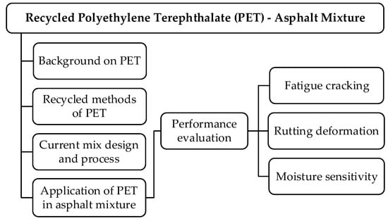 The civil engineering field has increasingly applied recycled PET waste in pavement construction to reap the economic and environmental benefits. This article provided an overview of the benefits of reusing solid waste, such as PET waste, to benefit the asphalt pavement industry. The supply and demand for recycled PET could be leveraged to save costs and increase waste management efficiency. Besides, new projects could be established to enhance the commercial feasibility of PET waste for pavement construction. For example, high quality and eco-friendly asphalt pavements could be developed for the future. On the other hand, PET has a high melting point temperature of about 250 °C, but if it is mixed with the asphalt binder via the wet process, PET will not maintain its homogeneity in the asphalt mixture. Thus, most studies used the dry process to add PET to asphalt mixtures. These studies focused on using recycled PET flakes in the asphalt mixture as fine aggregate replacement. The results showed increased resistance to rutting deformation and fatigue in the modified pavement compared to the unmodified ones. The studies conclude that replacing the aggregates in asphalt mixtures with PET particles could enhance the mechanical properties of the asphalt. Almost all studies reported that adding a lower proportion of PET (2–4%) would result in better resistance against rutting. The addition of PET particles in asphalt mixtures also increased resistance to fatigue. Besides, lower PET content also caused better moisture resistance. Moreover, PET had a limited effect on moisture susceptibility. Generally, the results showed that using optimum PET proportions significantly enhanced the performance of pavement structures. Finally, using PET waste as an additive in asphalt mixtures could serve as an environmentally friendly method to dispose of PET waste while simultaneously producing high quality pavements.