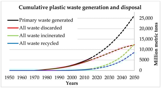 The accumulated quantity of the generated plastic waste and Disposed 1950 to 2015 and the expected quantity by 2050 [1].
