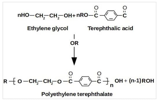 Virgin PET is a superior material for certain applications. This material has several excellent characteristics, such as good tensile strength, reasonable thermal stability, chemical resistance, processing capability, color capability, and clarity [27]. It can be formed by pressures and at normal temperatures. PET can be created from petroleum hydrocarbons, from the reaction between ethylene glycol and Terephthalate acid, as shown in Figure 4 [28]. The basic physical and chemical properties of commercially-used PET plastics are indicated in Table 1 [27].