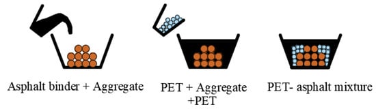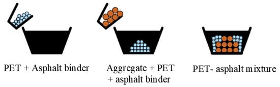 There are two ways to blend plastic with asphalt mixtures: (1) dry and (2) wet. The dry process requires adding the PET in the final segment of the mixing process and after introducing and incorporating the asphalt binder with the aggregate, as shown in Figure 5. Meanwhile, the wet process combines the PET material with the asphalt binder and blends it. Then, a “plastic-modified asphalt binder” is applied to the heated aggregates, as shown in Figure 6. However, studies have noted that it is not feasible to introduce PET as an additive into asphalt mixtures via the wet process because PET has a melting point of around 250 °C, so it is quite difficult for it to maintain a homogenous mixture. The mixture will also tend to separate from the asphalt binder [38]. On the contrary, in a study conducted by this process. The results showed that the micronized PET mixtures could improve the mechanical performance of asphalt mixtures if compared to conventional ones, due to the fine PET particles which are easy to mix with asphalt binder [39]. Meanwhile, in the dry process, it has been proved to help enhance the performance of asphalt mixtures [35,40]. Table 2 presents the summary of PET blending process by the dry and wet method.
