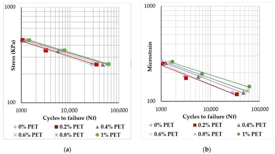 (a) Relationship between fatigue life (Nf) and stress at different % of PET; (b) Relationship between fatigue life (Nf) and strain at different % of PET [36].