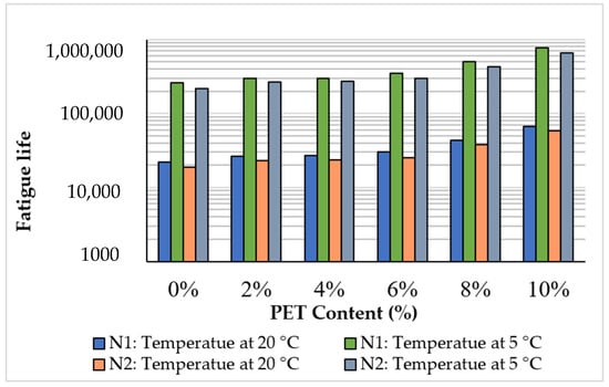 Moghaddam et al. [36] studied the fatigue characteristic of an SMA mixture by introducing PET particles. Indirect Tensile Fatigue Test (ITFT) results are reported for each percentage of PET content. Figure 7 presents the relationship between stress, or strain and fatigue life (Nf). The findings indicate that the addition of a high amount of PET to the asphalt mixtures improved the fatigue life of the pavement compared to traditional mixtures. The high fatigue life could be attributed to certain causes such as the improved elastic property of the PET-reinforced asphalt mixture and stress reduction due to the addition of the PET particles. In another investigation, Moghaddam, et al. [41] evaluated different percentages of PET waste. The researchers concluded that because PET particles have a high melting temperature, the particles would not melt and would still be rigid in the asphalt mixture. The study found that fatigue life increased by increasing the percentage of PET. Also, a high level of PET improved the mixture’s flexibility. Additionally, the crack creation and propagation in the asphalt mixture was delayed compared to conventional mixtures. Modarres and Hamedi [38] observed the impact of recycled PET particles on the fatigue life of asphalt mixtures at 5 and 20 °C and the results have been shown in Figure 8 based on at first and second fatigue life definition (N1&N2). They found that the PET-modified asphalt mixture had improved fatigue properties and flexibility compared to the traditional mixture, at 5 and 20 °C. Additionally, it was noted that fatigue life increased when the test temperature was reduced. In another study, Mohd et al. [58] investigated the impact of adding recycled PET as a replacement for the fine aggregates in asphalt mixtures based on the change in fatigue properties. They noted that the asphalt mixture with 5% and 15% PET had more resistance to fatigue damage than traditional asphalt.