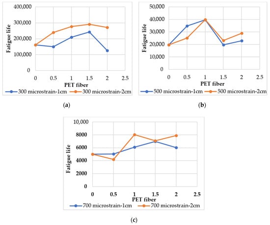 (a) Fatigue life at initial strain of 300 microstrain with PET length 1 cm and 2 cm; (b) Fatigue life at initial strain of 500 microstrain with PET length 1 cm and 2 cm; (c) Fatigue life at initial strain of 700 microstrain with PET length 1 cm and 2 cm [43].