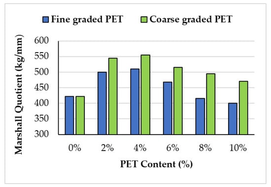 Ahmadinia et al. [40] found that adding PET to stone mastic asphalt (SMA) mixtures produced less permanent deformation (rutting) than unmodified mixtures and increased with adding a high content of PET. The same result was reported by Taherkhani and Arshadi [45] as displayed in Figure 11. The result shows the values of MQ versus PET content. Moreover, the study showed that the fine-graded of PET particles yielded more significant performance than the coarse-graded PET particles. Mohd et al. [50] studied the rutting deformation of and asphalt mixture with the addition of (5% to 25% PET) by weight of asphalt. At 20% PET content specifically, the study found that rutting resistance and recovery significantly improved compared to the unmodified traditional mixture. Therefore, the addition of PET particles to replace the fine aggregate in the asphalt yielded favorable results. Moghaddam et al. [42] assessed the rutting characteristics of asphalt pavement with PET flakes as an additive. Based on the permanent strain of all specimens under different stress levels and temperatures, a higher PET content resulted in mixtures with better resistance to rutting deformation. The reason is that PET is a semi-crystalline material. The study concluded that the addition of PET particles enhanced the properties of the asphalt mixture. First, the melted PET particles improved the adhesion between the asphalt binder and the aggregate. Secondly, solid PET particles could absorb some of the impact from applied loading.